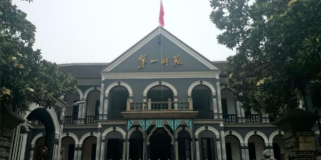 湖南第一师范前身为南宋理学家张栻于1161年创办的城南书院,1903年始立湖南师范馆,享有“千年学府,百年师范”之美誉。学校旧址坐落在长沙市天心区书院路(黄兴南路步行商业街附近),北枕妙高峰,西临湘江水,与天心阁、杜甫江阁隔街相邻,与橘子洲、岳麓山隔江相望,风景优美,簧舍壮观。旧址占地66670平方米,其中文物建筑面积26343平方米,采用庭院式布局,以长廊迂行绕室,并以青灰色墙面配以白色的门窗檐框与柱饰,宁静别致,庄重典雅,是集东方文化内涵与西方建筑风格于一体的建筑艺术珍品。