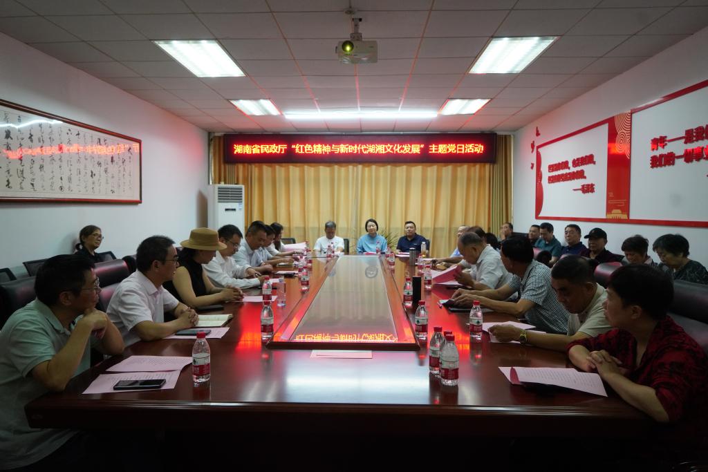 9月13日上午,湖南省民政厅退休人员第三党支部“红色精神与新时代湖湘文化发展”主题党日活动在中南大学红色文化创作与研究中心举行。省民政厅原党组书记、厅长余长明、段林毅,省民政厅原巡视员、党支部书记李劲夫,省民政厅原巡视员张成桂,省民政厅原党组成员、副厅长祝青云,省民政厅原一级巡视员杨微、陈慈英,省民政厅原党组成员李文玉,省民政厅原副巡视员周建忠,省民政厅原二级巡视员邓洪波出席活动,中南大学党委常委、副校长何军,中南大学人文学院党委书记罗军飞,中南大学离退休处处长向英明,人文学院党委副书记刘亚红,副院长刘新少,中文系教授、中南大学红色文化创作与研究中心主任聂茂,传媒系副教授、中南大学红色文化创作与研究中心秘书长朱承璋陪同。省民政厅相关干部、工作人员等40余人参加活动。活动由李劲夫主持。