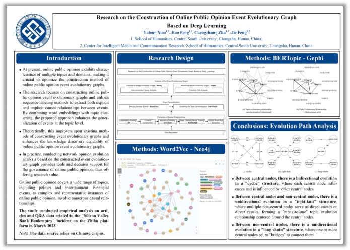 2024年6月20日至24日,第74届国际传播学会年会(74th Annual International Communication Association Conference,ICA 2024)在澳大利亚黄金海岸(Gold Coast)举行。我院智媒传播研究中心团队撰写的论文被大会“Information Systems”分论坛录用并作报告。论文标题:Research on the Construction of Online Public Opinion Event Evolutionary Graph Based on Deep Learning,作者:肖亚龙、冯皓(传媒系硕士研究生)、朱承璋、冯杰(通信作者)。